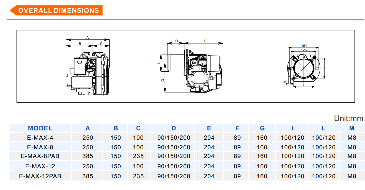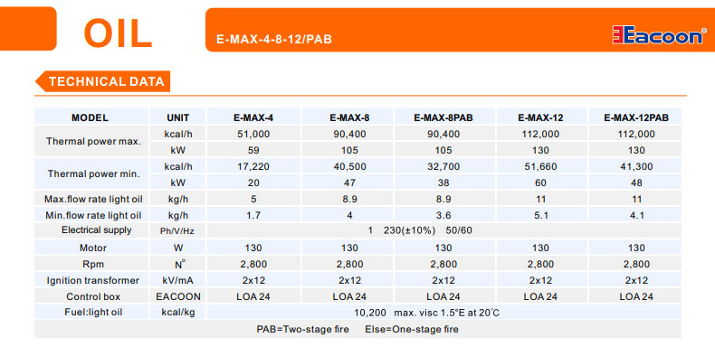 E-MAX 4/8/12 industrial fuel oil burner is a small industrial model burner with a power range between 51-112kW. It uses the European E brand's ignition and burner control system,suitable for small steam generators, incinerator, and commercial kitchen.